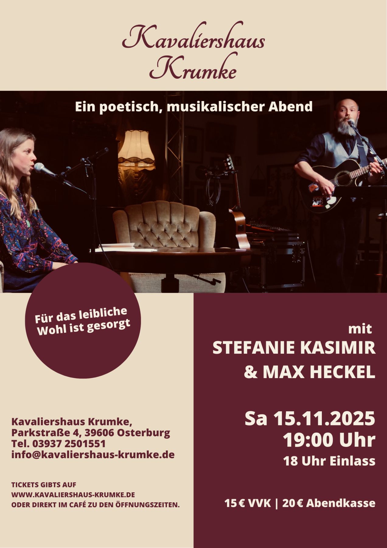 Compre boletos en línea. Venta anticipada del 06.10.2025 al 14.11.2025 Entradas para Stefanie Kasimir & Max Heckel – Musik & Poesie15. November 2025 im Kavaliershaus KrumkeKavaliershaus Krumke, Parkstraße 4, 39606 Osterburg (Altmark)Admisión a las 18:00 horas